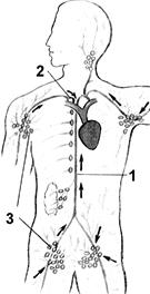 В узлах лимфа протекает по узким щелям (синусам), в которых задерживаются и уничтожаются лимфоцитами чужеродные тела. Лимфа от ног и кишечника собирается в левую-, от правой стороны тела — в правую подключичную вены. Лимфа не содержит эритроцитов, тромбоцитов, но в ней много лимфоцитов. Свертывается медленно, движется за счет сокра-