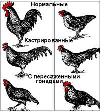 Половые железы. Яичники у женщин и семенники у мужчин являются железами смешанной секреции. Внешнесекреторная деятельность — образование сперматозоидов семенниками, яйцеклеток — яичниками; внутрисекреторная у семенников связана с образованием лейдиговыми клетками яичка мужских половых гормонов — тестостерона и андростерона, которые стимулируют развитие первичных и вторичных половых признаков, полового влечения. Под вторичными половыми признаками подразумеваются различия у мужчин и женщин в развитии скелета и мускулатуры, особенностях фигуры, в распределении волосяного покрова, в тембре голоса и развитие подкожной жировой клетчатки, в своеобразии психики.