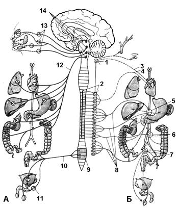 1 –шейный узел симпатического ствола; 2 — боковой рог спинного мозга и симпатический ствол; 3 — шейные сердечные нервы; 4 — грудные сердечные и легочные нервы; 5 — чревное (солнечное сплетение); 6 — брыжеечное сплетение; 7 — верхнее и нижнее подчревные сплетения; 8 — внутренностные нервы; 9 — крестцовые парасимпатические ядра; 10 — тазовые внутренностные нервы; 11 — тазовые парасимпатические узлы; 12 — блуждающий нерв; 13 — парасимпатические узлы головы; 14 — парасимпатические ядра в стволе головного мозга.