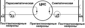 Парасимпатическая нервная система оказывает противоположное действие, "стоп — система". Предузловые нейроны находятся в среднем, продолговатом мозге и в крестцовом отделе спинного мозга, постганглионарные — в узлах около внутренних органов. Медиатор, выделяемый синапсами в обоих типах нейронов — ацетилхолин (рис. 234). Функции: — обратные.
