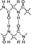 карбоксильными группами и аминогруппами, расположенными на соседних витках спирали (рис. 258). Практически все СО- и NН-группы принимают участие в образовании водородных связей. Они слабее пептидных, но, повторяясь многократно, придают данной конфигурации устойчивость и жесткость.