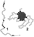 1 — первичная структура молекулы ферментного белка (черным цветом обозначены аминокислоты, входящие в состав активного центра фермента); 2 — схематическое изображение фермент-субстратного комплекса.