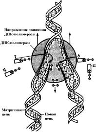 Репликация — сложный процесс, идущий с участием ферментов (ДНК-полимераз) (рис. 276). Репликация осуществляется полуконсервативным способом, то есть под действием ферментов молекула ДНК раскручивается и около каждой цепи, выступающей в роли матрицы, по принципу комплементарности достраивается новая цепь. Таким образом, в каждой дочерней ДНК одна цепь является материнской, а вторая — вновь синтезированной. Раскручивание молекулы происходит на небольшом отрезке (несколько десятков нуклеотидов), называемом репликативной вилкой. После окончания синтеза дочерних цепей ДНК на данном участке и соединения их с материнскими раскручивается новый отрезок, и цикл репликации повторяется. Таким образом, репликативная вилка перемещается вдоль молекулы, пока не дойдет до точки окончания синтеза.