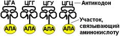 Рис. 293. Аланиновые тРНК, чьи антикодоны комплементарны кодовым триплетам ГЦУ, ГЦЦ, ГЦА, ГЦГ.