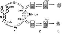 1 — митотический цикл; 2 — переход в дифференцированное состояние; 3 — гибель.