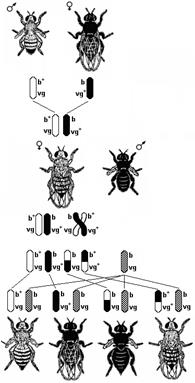 Скрещивая мушку дрозофилу с серым телом и нормальными крыльями с мушкой, имеющей темную окраску тела и зачаточные крылья, в первом поколении Морган получал гибридов, имеющих серое тело и нормальные крыльяи (ген, определяющий серую окраску брюшка, доминирует над темной окраской, а ген, обусловливающий развитие нормальных крыльев — над геном недоразвитых) (рис. 327). При проведении анализирующего скрещивания самки F1 с самцом, имевшим рецессивные признаки, теоретически ожидалось получить потомство с комбинациями этих признаков в соотношении 1:1:1:1. Однако в потомстве явно преобладали особи с признаками родительских форм (41,5% серые длиннокрылые и 41,5% черные с зачаточными крыльями) и лишь незначительная часть мушек имела перекомбинированные признаки (8,5% черные длиннокрылые и 8,5% серые с зачаточными крыльями).