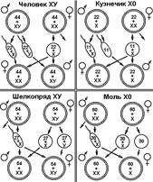 Рис. 329. Основные типы хромосомного определения пола.