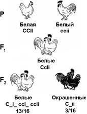 При скрещивании, например, леггорнов (ССII)с плимутроками (ссii), все потомство F1 имеет белую окраску, которая определяется наличием в их генотипе гена-подавителя (СсIi). Если же гибридов F1 скрестить между собой, то во втором поколении происходит расщепление по окраске в отношении 13/16 белых: 3/16 окрашенных. Окрашенным оказывается та часть потомства, в генотипе которой имеется ген окраски и отсутствует его подавитель (С_ii).