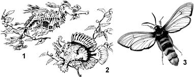 1 — морской конек-тряпичник; 2 — рыба-клоун; 3 — бабочка-стеклянница.