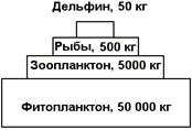 Когда растительность поедается консументами, происходит окисление органического вещества растений и выделение энергии, часть которой выделяется в форме тепла, другая часть, от 5 до 20% запасается в образованном органическом веществе консументов 1-го порядка. На прирост биомассы консументов 2-го порядка пойдет также около 5 — 20% от съеденной пищи. Если для простоты взять на прирост биомассы 10% от съеденной пищи, то дельфин массой 50 кг съел 500 кг рыбы, которой понадобилось 5000 кг зоопланктона, а в основании этой экологической пирамиды будут находиться съеденные зоопланктоном 50000 кг фитопланктона. Это правило экологической пирамиды — биомасса каждого последующего уровня в пищевой цепи прогрессивно уменьшается — верно для большинства экосистем. Различают пирамиду чисел, когда сравнивается число осо-