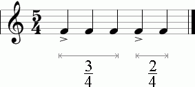 Количество сильных долей в смешанном метре соответствует числу простых метров, входящих в его состав. В первом случае, когда метр 5/4 образован за счёт слияния метров 2/4 и 3/4, сильными долями будут первая (сильная доля метра 2/4) и третья (сильная доля метра 3/4). Если же мы изменим порядок следования простых метров, т.е. сначала 3/4, а за ним 2/4, то сместим вторую сильную долю с третьей на четвёртую: