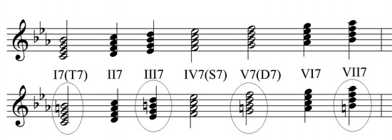 Малый минорный септаккорд - на I, IV и V ступенях