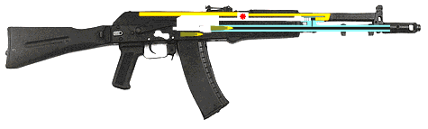 U-подібним прорізом – задній прицільний пристрій (приціл) та циліндричної шпильки у захисному кожусі – передній прицільний пристрій (мушка). Пластмасові деталі армовані скловолокном і виготовлені з чорного поліаміду з фосфатно-лаковим покриттям. Приклад, що складається, створює зручність при транспортуванні, крім того автомати обладнані пристроєм для установки підствольного гранатомета, оптичних і нічних прицілів.