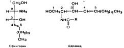 Гликосфинголипиды - гликолипиды, в состав к-х входят церамид и один или несколько остатков углеводов, и к-та. Локализованы в мембр.клеток так, что углеводная часть молек. расп. на пов-ти кл. и часто обладает АГ св-вами. Синтез нач. с обр. церамида. Серин конденсируется с пальмитоил-КоА. Продукт их взаимодействия сначала восст.НАДФН, затем к аминогруппе дигидросфингозина амидной связью присоед. жир. к-та. После окисления ФАД-зависимой дегидрогеназой обр. церамид, к-й служит предш. в синтезе гликосфинголипидов. Послед. р-ции синтеза катализ. специф. трансферазами. Соед. фосфорилхолина с церамидом сфингомиелинсинтазой приводит к образованию сфингомиелина. Присоединение углеводных компонентов катализируется специф. гликозилтрансферазами. Донорами углеводных компонентов служат активированные сахара: УДФ-галактоза и УДФ-глюкоза. Галактоцереброзид - главный липид миелиновых об-к; глюкоцереброзид входит в состав мембран многих клеток и служит предш. в синтезе более сложных гликолипидов.