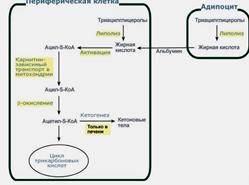 Синтезированные в печени жиры упаковываются в ЛПОНП и секретируются в кровь. Гидролиз внутриклет. жира осущ. под действием гормончувствительного фермента ТАГ-липазы. Глицерол как водорастворимое в-во транспортируется кровью в своб. виде, а жир. к-ты (гидрофобные молекулы) в комплексе с белком плазмы - альбумином. Регуляция: в абсорбтивном состоянии под действием инсулина происходит липогенез, в постабсорбтивном состояни-липолиз-расщепление жиров, активируемый глюкагоном. Адреналин, секреция которого увеличивается при физической активности, также стимулирует липолиз. В абсорбтивный период при увеличении соотношения инсулин/глюкагон в печени активируется синтез жиров.