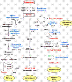 165. Роль тирозина в метаболизме человека и животных.–частично заменимая ам-к. относится к смешанным (гликокетонным)ам-к в мозговом в-ве синтезируются катехоламины. Нарушение катаболизма тирозина на стадии расщепления гомогентизиновой к-ты приводит к алкаптонурии («черная моча». Врожденная болезнь. Наследственный дефект тирозиназы-фермента, катализирующего в меланоцитах превращение из тирозина в ДОФА вызывает наруш.синтеза темных пигментов кожи-к альбинизму. Недостаточность дошамина приводит к болезни Паркинсона- симптомы – акинезия(скованность). ригидность(напряж.мышц), тремор.