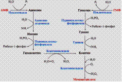Образование мочевой к-ты происх.в печени и в кишечнике. У чел-ка моч.к-та явл.конечным продуктом обмена пуринов и выводится с мочей. В норме содержание моч.к-ты в сут.моче-400-600мг/дл. А в крови – 3-7-мг/дл. Увеличение-гиперурикимия. Подагра – заболевание, при котором мочевая к-та и ураты из-за плохой растворимости начин.кристализоваться и откладываться в суставных хрящах, связказ и мяг.тканях, вызывая воспаление суставов и мочекаменную болезнь. Генетически болезнь вызвана дефектами -ФРДФ-снтетазы, связанными с гиперактивацией фермента/ -частичной потерей активности гипоксантин-гуанинфосфорибозилтрансферазы, обеспечивая повторное исп.пуринов.