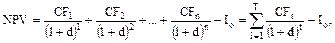 где CF – чистые денежные потоки через 1, 2, … n год, руб; d – ставка дисконтирования; Io – инвестиционные затраты, руб; T – срок жизни проекта, лет.