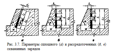 На карьерах широко распространены вертикальные скважины (б, в). Горизонтальные скважины используют изредка и, как правило, в сочетании с вертикальными, для взрывания высоких уступов или их выполаживания (заоткоски) при подходе к предельному контуру. Наклонные скважины, пробуренные параллельно откосу уступа (а), обеспечивают отрыв пород по линии скважин, высокую степень дробления я хорошую проработку подошвы, так как сопротивление породы взрыванию постоянно по высоте уступа. Часть отечественных буровых станков обеспечивает строго фиксированные углы наклона скважин – 90°, 75°, 60° (приложения 15 и 16).