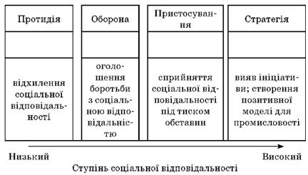 Ставлення до соціальної відповідальності може бути різним: від сприятливого до ворожого. На рис. 13.1 представлена характеристика чотирьох стратегій ділових організацій щодо соціальної