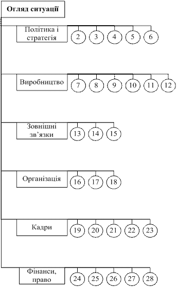 | Позначення 1 - Огляд ситуації. 2 - Розстановка пріоритетів. 3 - Мотивація керівників. 4 - Корпоративні цілі. 5 - Охорона довкілля на підприємстві. 6 - Менеджмент безпеки праці. 7 - Розробка продукції. 8 - Управління матеріально-технічним постачанням. 9 - Технологія виробництва. 10 - Енергія і вода. 11 - Управління потоками відходів. 12 - Забруднені об'єкти. 13 - Екологічний маркетинг. 14 - Громадські зв'язки. 15 - Зовнішньоекономічні зв'язки. 16 - Стан території. 17 - Будівлі і приміщення. 18 - Транспортні засоби, автопарк. 19 - Мотивація персоналу. 20 - Навчання. 21 - Умови праці. 22 - Харчування в їдальні. 23 - Екологічне консультування. 24 - Державні субсидії. 25 - Страхування. 26 - Правові аспекти. 27 - Відповідальність за шкоду. 28 - Кримінальна відповідальність. |