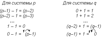 2. из числа Zp вычтем 1 по правилам вычитания системы p, т.е. Zp := Zp–1 и добавим ее к Zq по правилам сложения системы q, т.е. Zq := Zq + 1;