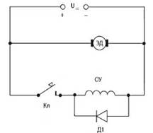 Такой режим работы транзистора рассматривался уже давно. В августовском номере журнала «Радио» 1959 года была опубликована статья Г. Лаврова «Полупроводниковый триод в режиме ключа». Автор статьи предлагал регулировать частоту вращения коллекторного двигателя изменением длительности импульсов в обмотке управления (ОУ). Теперь подобный способ регулирования называется ШИМ и применяется достаточно часто. Схема из журнала того времени показана на рисунке 3.