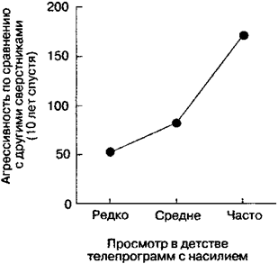 Воздействие средств массовой информации на выражение агрессии детьми.Вопрос о том, повышается ли уровень агрессии детей вследствие просмотра телепередач, включающих сцены насилия, до сих пор остается спорным. Хотя многие наблюдатели считают, что насилие, показываемое по телевидению, воздействует на поведение детей, другие полагают, что сцены насилия могут иметь катарсический эффект, то есть они могут фактически приводить к снижению уровня агрессии, позволяя детям выражать агрессию косвенно, тем самым «удаляя ее из их системы». Для исследования косвенного выражения агрессии проводилось наблюдение за детьми во время просмотра телевизионных передач. В одном из экспериментов одна группа детей смотрела мультфильмы со сценами насилия, а другая (с той же продолжительностью) — мультфильмы без насилия. Дети, смотревшие мультфильмы с насилием, становились более агрессивными при контактах со сверстниками, тогда как у детей, смотревших мультфильмы без насилия, изменений в агрессивности не наблюдалось. Более того, эффекты телевизионной демонстрации насилия могут быть затяжными: чем больше программ с насилием мальчик смотрит в 9 лет, тем с большей вероятностью он окажется агрессивнее в 19 лет (рис. 1.3).