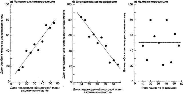 Рис. 1.6. Графики рассеивания, иллюстрирующие корреляцию.Эти гипотетические данные принадлежат 10 пациентам, каждый из которых имеет некоторое повреждение участков мозга, ответственных, насколько известно, за узнавание лиц. На рис. 1.6а пациенты располагаются вдоль горизонтали соответственно объему повреждения мозга, причем самая левая точка показывает пациента с наименьшим повреждением (10%), а самая правая точка показывает пациента с наибольшим повреждением (55%). Каждая точка на графике отражает показатель для отдельного пациента в тесте на узнавание лиц. Корреляция положительная и равна 0,90. На рис. 1.6б изображены те же самые данные, но теперь они показывают долю правильных ответов, а не ошибок. Здесь корреляция отрицательная, равная -0,90. На рис. 1.6в успехи пациентов в тесте на распознавание отображены в зависимости от их роста. Здесь корреляция равна нулю.