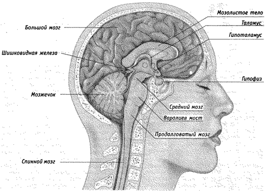 Рис. 2.11. Мозг человека.Схематически показаны основные структуры центральной нервной системы (у спинного мозга показана только верхняя часть).