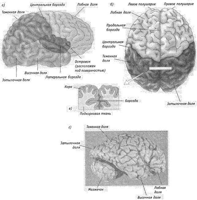Рис. 2.12. Большие полушария мозга.В каждом полушарии есть несколько больших долей, разделяемых бороздами. Помимо этих видимых снаружи долей в коре есть большая внутренняя складка, называемая «островок» и находящаяся глубоко в латеральной борозде, а) вид сбоку; б) вид сверху; в) поперечное сечение коры мозга; обратите внимание на разницу между серым веществом, лежащим на поверхности (изображено более темным), и более глубоко лежащим белым веществом; г) фотография мозга человека.