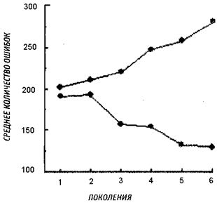 Рис. 2.21. Наследование научения прохождению лабиринта у крыс.Средние показатели ошибок у «умных» и «тупых» крыс, выведенных путем отбора по способности к прохождению лабиринта (по: Thompson, 1954).