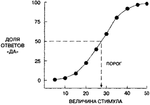 Процедуры для определения абсолютного порога называются психофизическими методами. В одном из широко применяемых методов экспериментатор сначала отбирает набор стимулов, интенсивность которых близка к пороговой (например, набор лампочек с разной интенсивностью слабого свечения). Стимулы предъявляются испытуемому по одному в случайном порядке, а он должен сказать «да», если стимул обнаружен, и «нет» — если не обнаружен. Каждый стимул предъявляется по многу раз, и для стимула каждой величины определяется доля положительных ответов.