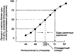 Эксперимент по определению едва заметного различия — сокращенно ЕЗР — можно провести следующим образом. Вспыхивает пятно света (стандарт), а над ним на более короткое время вспыхивает другое пятно света (инкремент). [Пятно, отличающееся от стандартного по яркости в большую (инкремент) или меньшую (декремент) сторону — Прим. перев.] Стандартное пятно остается одним и тем же во всех пробах, а интенсивность инкрементного пятна меняется от пробы к пробе. Испытуемый отвечает «да» или «нет» соответственно тому, кажется ли ему инкрементное пятно более ярким, чем стандартное, или нет. Если испытуемый в половине попыток может отличить инкремент от стандарта, когда интенсивность инкремента 51 ватт, а стандарта — 50 ватт, то при этих условиях ЕЗР равно 1 ватт.