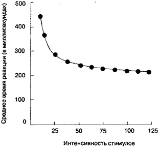 Рис. 4.3. Влияние интенсивности стимулов на простое время реакции.Среднее время реакции для всех качеств стимулов сокращается по мере возрастания интенсивности подлежащих обнаружению стимулов. При определенном уровне интенсивности дальнейшее увеличение интенсивности уже не приводит к дальнейшему увеличению скорости реакции.