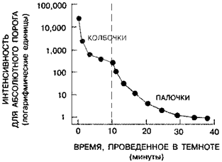 Рис. 4.12. Ход световой адаптации.Испытуемые смотрят на яркий свет, пока сетчатка не станет адаптированной к свету. Когда их после этого помещают в темноту, их световая чувствительность начинает постепенно расти, а абсолютный порог — снижаться. Этот процесс называется световой адаптацией. На графике показана величина порога через разное время после выключения адаптирующего света. Точки на верхней части кривой соответствуют пороговым вспышкам, цвет которых можно было различить; точки на нижней кривой соответствуют вспышкам, которые казались белыми независимо от их спектра. Заметьте резкий перелом кривой примерно на 10-й минуте; это называется палочко-колбочковым переходом. Во многих экспериментах показано, что первая часть этой кривой соответствует колбочковому зрению, а вторая — палочковому. Данные аппроксимированы по различным источникам.
