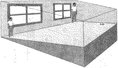 Рис. 5.27. Конструкция комнаты Эймса.На рисунке показана настоящая форма комнаты Эймса. На самом деле мальчик, который слева, находится почти вдвое дальше от наблюдателя, чем мальчик справа; однако при разглядывании комнаты через глазок это различие удаленности не обнаруживается (по: Goldstein, 1984).