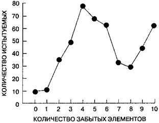 Рис. 6.5. Распределение постгипнотической амнезии.Испытуемые под гипнозом выполняли 10 действий, а затем им доли инструкцию на постгипнотическую амнезию. Когда их спрашивали, что происходило под гипнозом, испытуемые могли вспомнить разное количество действий: количество действий, забытых данным испытуемым, варьировалось от 0 до 10 элементов. В эксперименте участвовало 491 испытуемых, и график показывает количество испытуемых для каждого количества забытых элементов. На этом графике видно бимодальное распределение постгипнотической амнезии с максимумами забывания 4 и 10 элементов (по: Cooper, 1979).