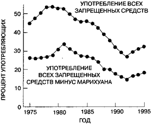 Рис. 6.6. Использование запрещенных средств.Доля американских старшеклассников, сообщавших, что они употребляют запрещенные средства за 12 месяцев перед окончанием средней школы. Верхняя кривая охватывает марихуану, галлюциногены, кокаин, героин и все не прописанные врачом опиаты, стимуляторы, седативные средства и транквилизаторы. В нижней кривой исключена марихуана (по: Johnston, O'Malley & Bachman, 1995). [У большинства людей пик потребления алкоголя приходится на возраст от 16 до 25 лет. — Прим. перев.]
