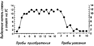 Рис. 7.2. Приобретение и угасание условной реакции.Левая кривая отражает стадию приобретения в эксперименте. Количество капель слюны, выделяемой в ответ на условный стимул (до предъявления БУС), показано на вертикальной оси; количество проб — на горизонтальной оси. После всех проб приобретения экспериментатор переходит к стадии угасания; результаты показаны на кривой справа (по: Pavlov, 1927).