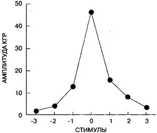 Рис. 7.3. Градиент генерализации.Стимул 0 означает тональный звук, который первоначально служил условным сигналом кожно-гальванической реакции (КГР). Стимулы +1, +2 и +3 представляют тестовые звуки, высота тона которых возрастает; стимулы -1, -2 и -3 представляют звуки, высота тона которых убывает. Заметьте, что величина генерализации уменьшается с возрастанием разницы между тестовым и тренировочным тонами.