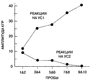 Рис. 7.4. Условная дифференцировка.Дифференцировочными стимулами служили два звуковых тона, сильно различающиеся по частоте (УС1 = 700 Гц, УС2 = 3500 Гц). Безусловным стимулом служило электрическое раздражение левого указательного пальца только в тех пробах, в которых предъявлялся УС1. Сила условной реакции, в данном случае КГР, постепенно возрастала вслед за УС1 и угасала вслед за УС2 (по: Baer & Fuhrer, 1968).