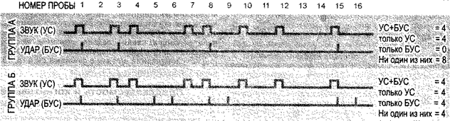 В одном важном эксперименте (Rescorla, 1967) одновременность сопоставлялась с предсказуемостью. В некоторых пробах собак раздражали электрическим током (БУС), а в каких-то из этих проб электрическому удару предшествовал звуковой сигнал (УС). Процедуры для двух экспериментальных групп показаны на рис. 7.5. Число совпадающих по времени пар из звука и удара током в обеих группах было равным. Независимой переменной в группе А был звук, появлявшийся перед каждым электрическим ударом, а в группе Б наличие или отсутствие звукового сигнала перед таким ударом было равновероятно, так что звук здесь не имел реальной предсказующей силы. Предсказующая сила звука оказалась решающей: в группе А условный рефлекс сформировался быстро, а в группе Б — нет (это определялось по тому, реагирует или нет собака на звук так, как если бы она хотела избежать удара током). В других группах этого эксперимента (на рис. 7.5 не показаны) сила обусловливания была непосредственно связана с предсказательной ценностью УС, сигнализирующего о появлении БУС. Последующие эксперименты подтверждают вывод, что отношение предсказания между УС и БУС важнее, чем совпадение их по времени или частота парного предъявления УС и БУС (Rescorla, 1972).