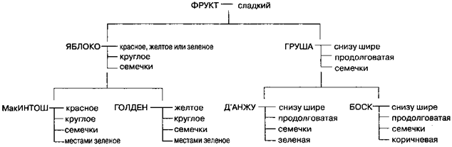 Помимо знания признаков понятий мы знаем также, как понятия связаны одно с другим. Например, «яблоки» являются представителем (или подмножеством) более общего понятия «фрукты»; «малиновки» являются подмножеством «птиц», которые, в свою очередь, являются подмножеством «животных». Эти два типа знания (признаки понятия и связи между понятиями) показаны на рис. 9.4 в виде иерархии. Такая иерархия позволяет нам заключать, что понятие обладает определенным признаком, даже когда он непосредственно не связан с этим понятием. Предположим, что свойство быть сладким не ассоциируется у вас непосредственно с яблоками сорта «Голден». Если вас спросят: «Сладкие ли яблоки "Голден"?», вы, вероятно, войдете в свою мысленную иерархию через узел «яблоко "Голден"» (рис. 9.4), проследите путь от «Голдена» к «фруктам», найдете свойство быть сладким, отложенное в памяти о «фруктах», и ответите: «да». Это означает, что время установления связи между понятием и признаком должно возрастать с взаимной удаленностью их в этой иерархии. Это предположение подтвердилось в экспериментах, где испытуемым задавали такие вопросы, как: «Яблоко сладкое?» и «Сладкие ли яблоки "Голден"?». Вопрос о яблоках «Голден» отнимал у испытуемых больше времени, чем вопрос о яблоке, поскольку в этой иерархии расстояние между «яблоками "Голден"» и «сладким» было больше, чем расстояние между «яблоком» и «сладким» (Collins & Loftus, 1975).