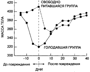 Одно из следствий наличия многих нервных систем регуляции аппетита состоит в том, что нельзя остановить потребление пищи, разрушив только один участок. Даже у животных с повреждением латерального гипоталамуса аппетит со временем восстанавливается. Если крыс кормить искусственно несколько недель или месяцев после повреждения, они начинают есть снова, но едят только для поддержания своего пониженного веса тела. Они как бы достигают гомеостаза на более низкой точке настройки. На самом деле крыс можно «защитить» от обычного сокращения количества пищи, наступающего после повреждения латерального гипоталамуса, если перед повреждением их посадить на диету, снижающую их вес (рис. 10.5).