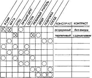 Рис. 13.5. Тест репертуара ролевых конструктов.В каждом ряду индивидуум сравнивает трех людей, указанных в верхней части таблицы, отмечая крестиком двух наиболее похожих друг на друга. Он описывает, в чем состоит их сходство, в графе «конструкт». После этого он описывает, чем третье лицо отличается от двух других, в графе «контраст». Данный индивидуум отмечает, что он считает себя и свою мать остроумными людьми, в отличие от своего лучшего друга, которого он считает лишенным чувства юмора. Процедура повторяется для каждого ряда таблицы.
