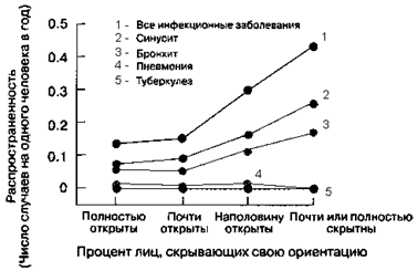 Рис. 14.6. Инфекционные заболевания как следствие сокрытия своей сексуальной ориентации.Мужчины-гомосексуалисты, скрывающие от других свою гомосексуальность, более подвержены различным инфекционным заболеваниям (по: Cole et al.,1996).