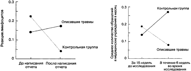 С другой стороны, открытое обсуждение своих отрицательных эмоций и важных вопросов, касающихся собственной жизни, по-видимому, положительно влияет на здоровье. В ходе широкомасштабной серии исследований Пеннбэйкер (Pennebaker, 1990) обнаружил, что следование рекомендациям описывать свои личные травмы в дневниках или эссе положительно влияет на здоровье. Так, в одном из этих исследований 50 здоровых студентов старших курсов были произвольным образом распределены по группам, которым было дано задание описывать либо наиболее травматические и неприятные события из своей жизни, либо свои мысли на отвлеченные темы по 20 минут в течение четырех дней. У испытуемых были взяты пробы крови в день, предшествующий началу выполнения задания, и в последний день выполнения задания, а также через шесть недель после окончания эксперимента, и проанализированы по ряду показателей функционирования иммунной системы. Также регистрировалось число случаев обращения этих студентов в медицинский центр их колледжа и сравнивалось с числом их обращений в центр до начала эксперимента. Как видно из рис. 14.7, студенты, описывавшие свои личные травмы, показали более позитивные результаты анализа иммунной системы и реже посещали медицинский центр, чем студенты из контрольной группы (Pennebaker, Kiecolt-Glaser & Glaser, 1988).