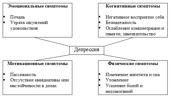 Рис. 15.4. Симптомы депрессии.Депрессия сопровождается эмоциональными, когнитивными, мотивационными и физическими симптомами.