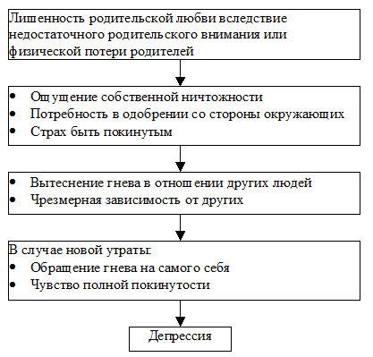 Рис. 15.6. Психодинамическая теория депрессии.Согласно психодинамической теории, депрессивные индивидуумы были лишены достаточного количества родительской любви в детстве, вследствие чего утрата любви и заботы в зрелом возрасте вызывает чувство собственной отвергнутости и ничтожности.